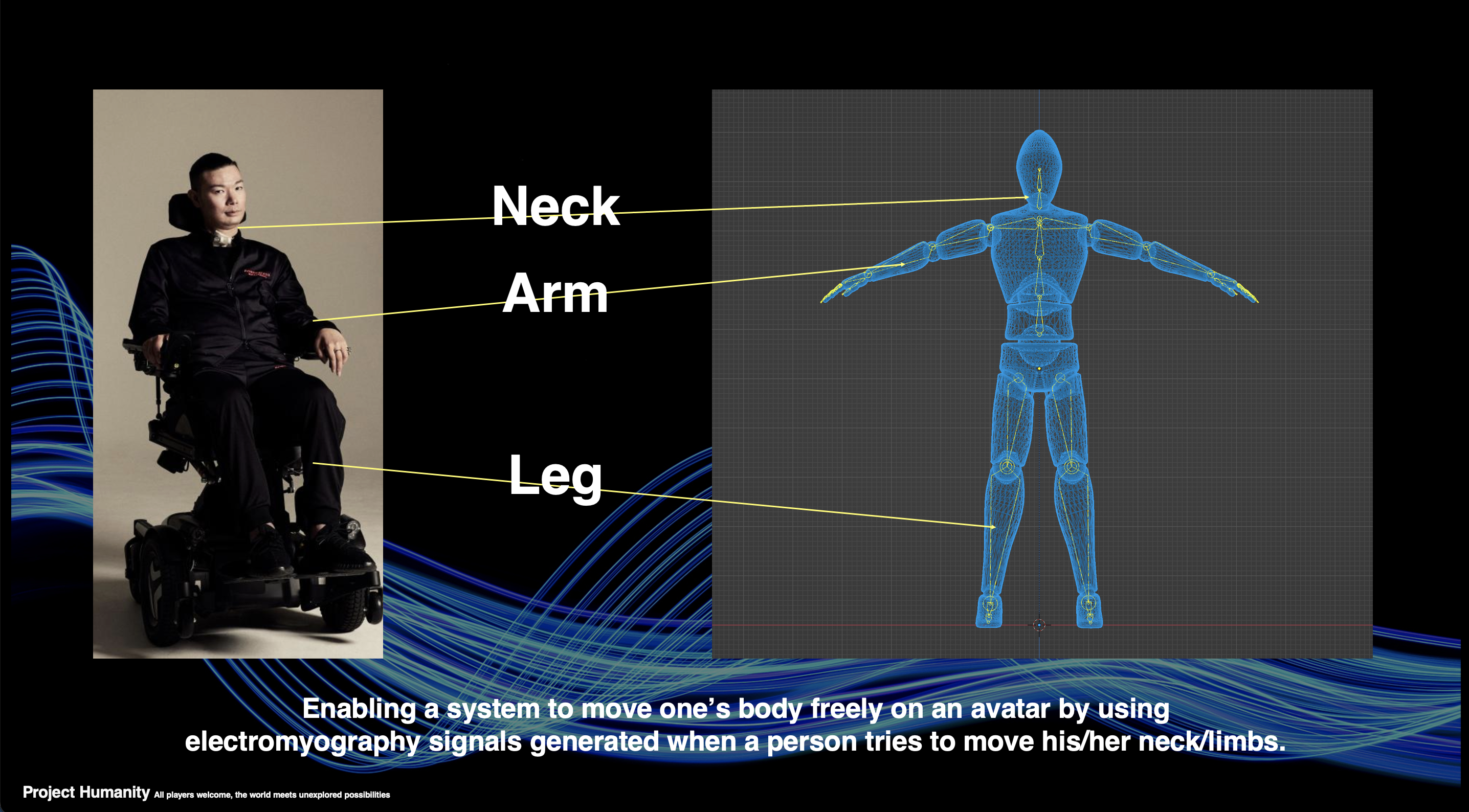 Therefore, we have developed a tool that detects minute changes in the electromyography signals of limbs and converts them into the motion of an avatar in the metaverse. ALS has been thought of as a disease that causes loss of physical abilities, but with this tool we aim to change that common belief.